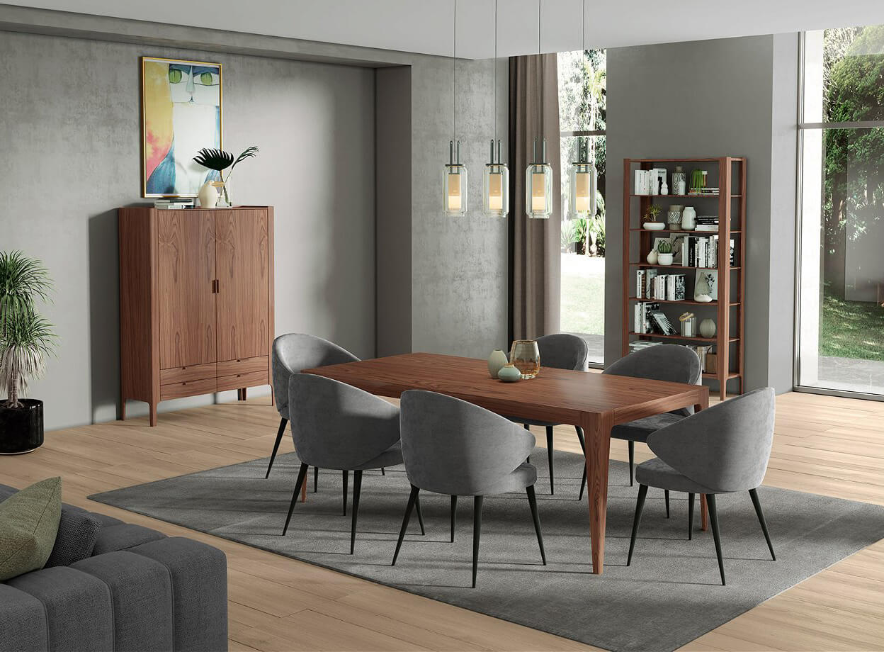 Aparador alto 2 puertas 4 cajones 3 baldas de cristal templado realizado en chapa natural de nogal o roble y DM lacado.