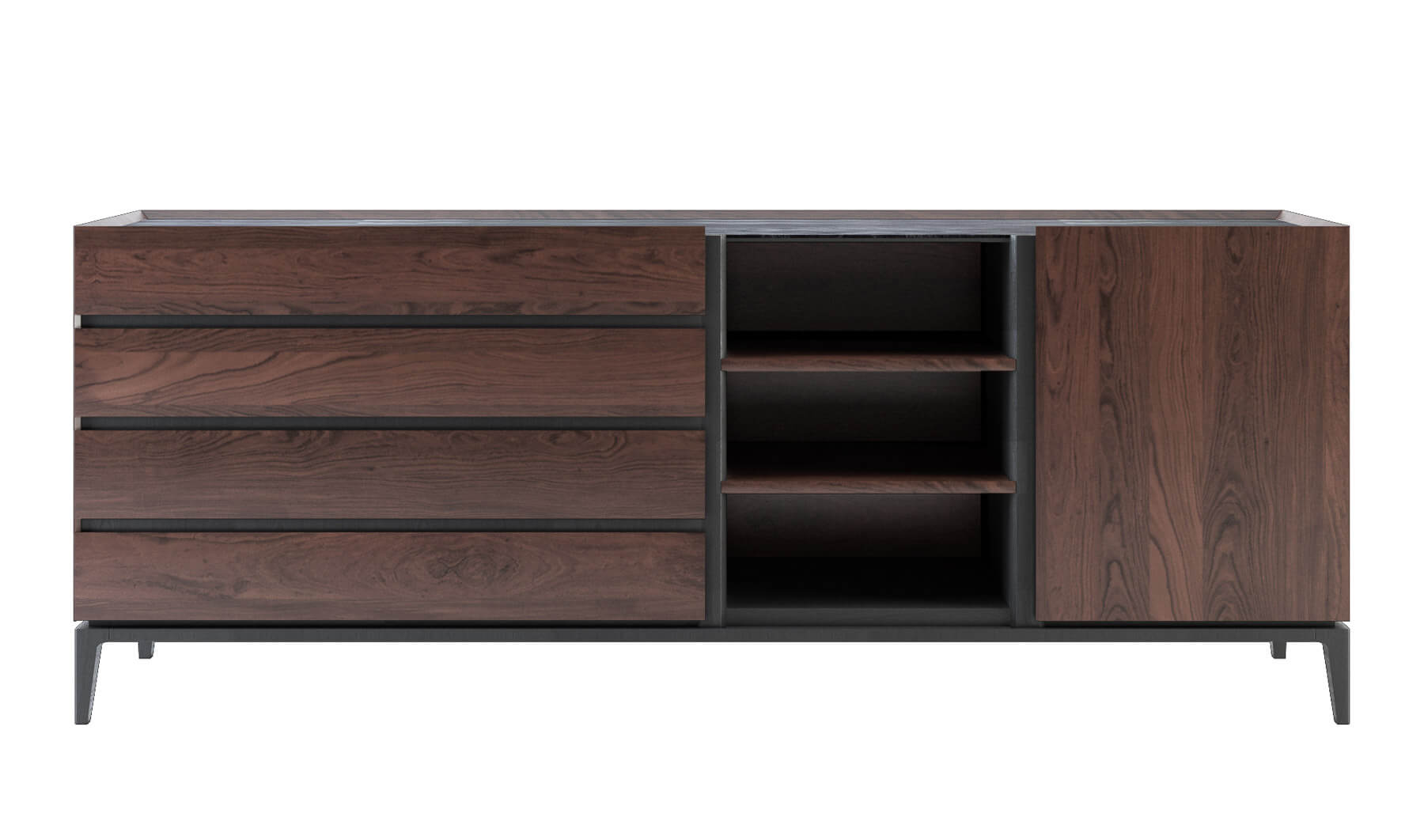 Aparador realizado con base en fresno acabado antracita, fresno blanqueado o fresno natural. El cuerpo del aparador está realizado en chapa natural de nogal canaletto o eucalipto fumé.Opcional: se puede realizar con tapa porcelánica.
