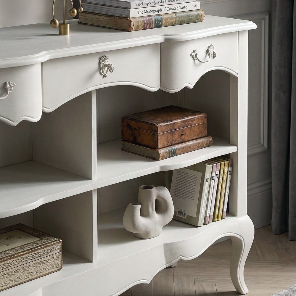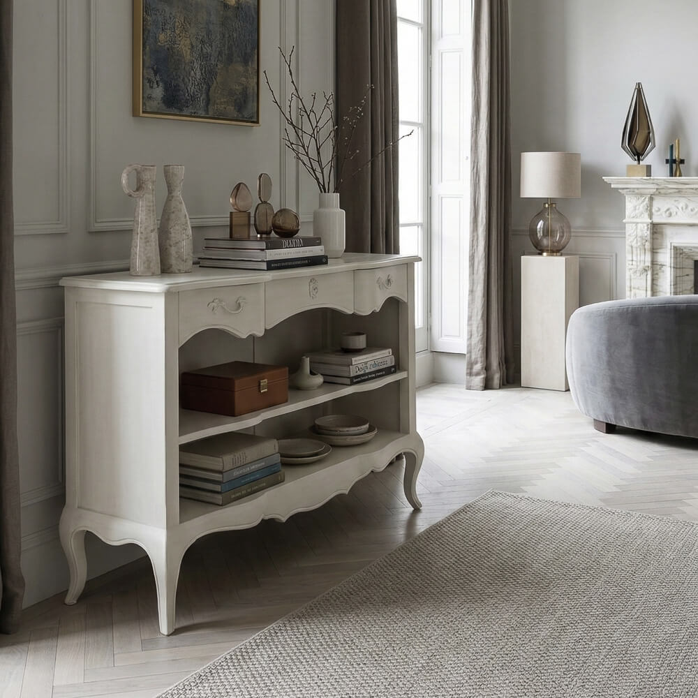 Lleva el encanto del chic romantico a tu hogar con el Buffet Lalie. Cuidadosamente tallado a mano por hábiles artesanos, esta pieza está hecha de madera de mindi con detalles de inspiración vintage es ta pintada artesanalmente en color marfil. Su estilo afrancesado y sus medidas contenidas lo hacen perfecto para encajar en cualquier entrada o comedor. ¡Dale carácter a tu decoración con el aparador Lalie hoy!