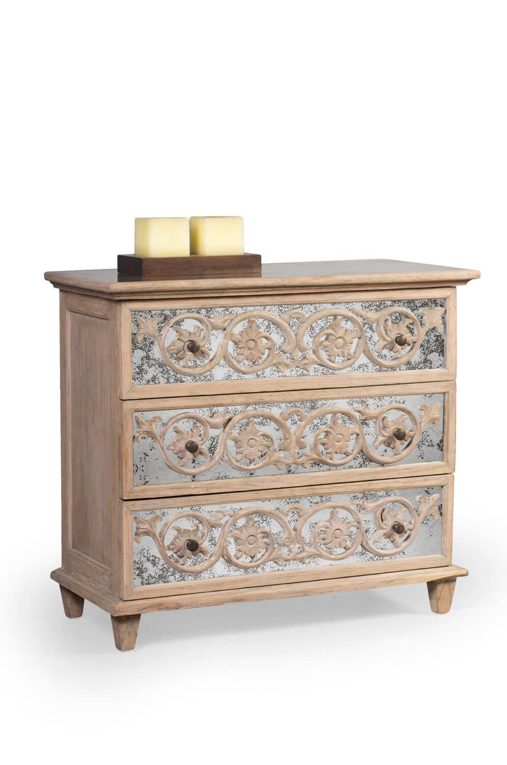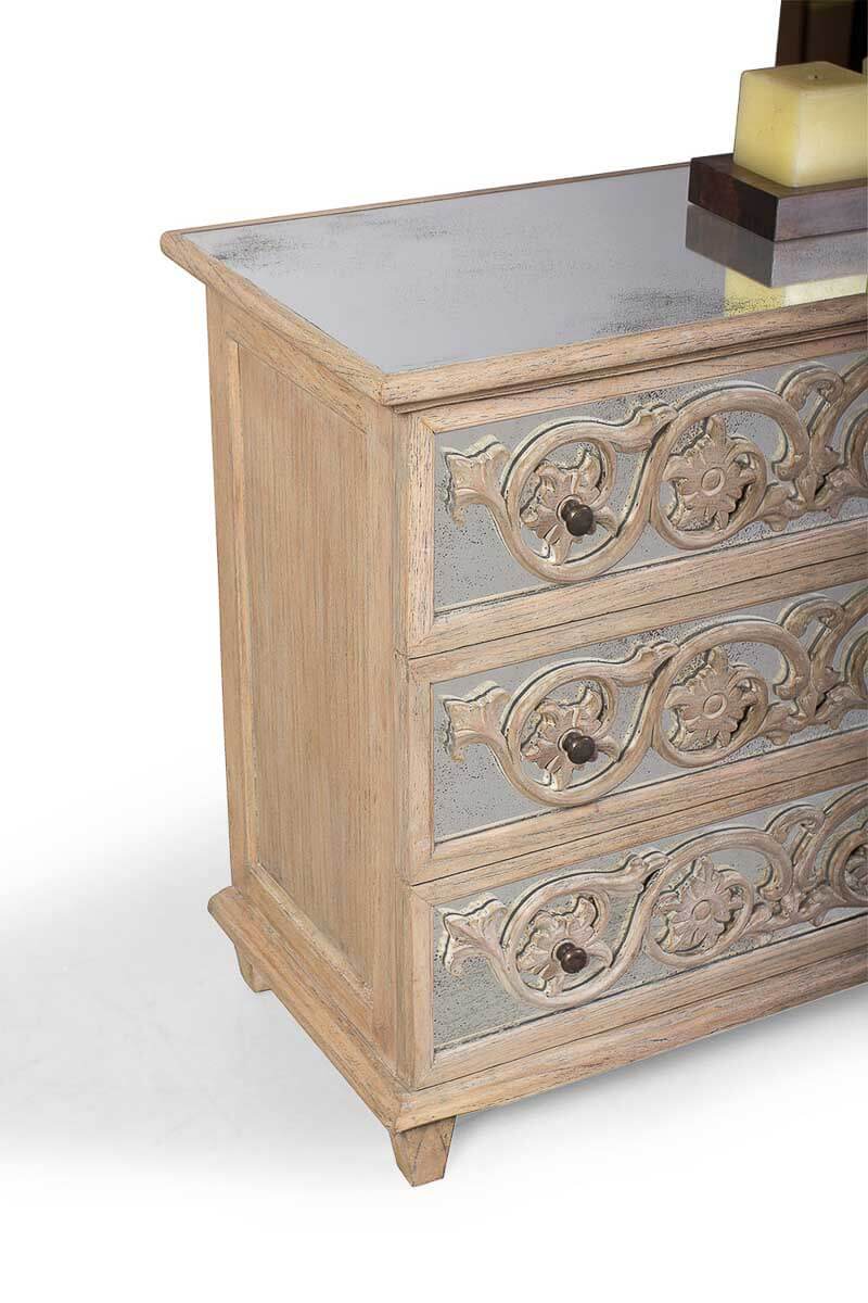 La cómoda esta realizada artesanalmente y tallada a mano en madera de Mindi con un acabado patinado que realza la belleza natural de esta madera. Los frentes de los cajones espejados contribuyen a dar un aire más liviano a esta pieza.