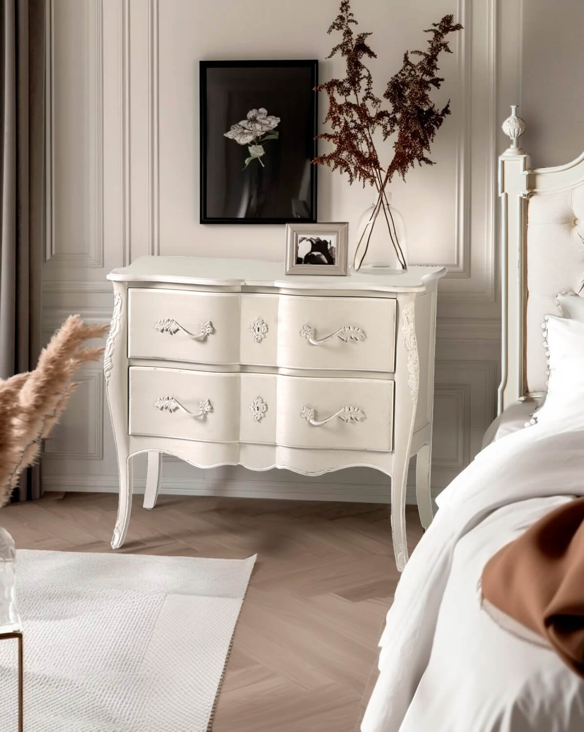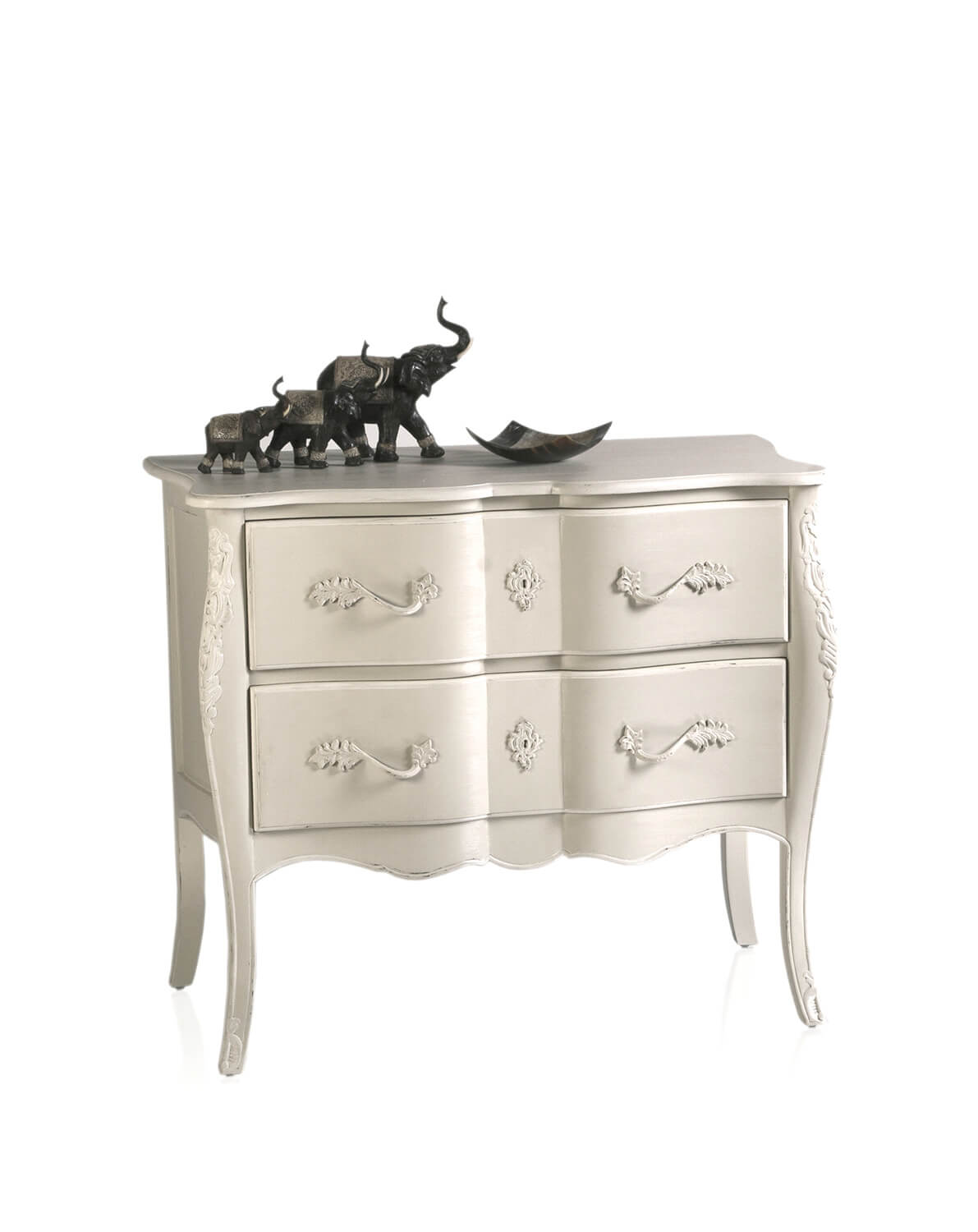 El modelo de cómoda que os sugerimos tiene un corte afrancesado, ideal para dar un toque de personalidad al dormitorio.