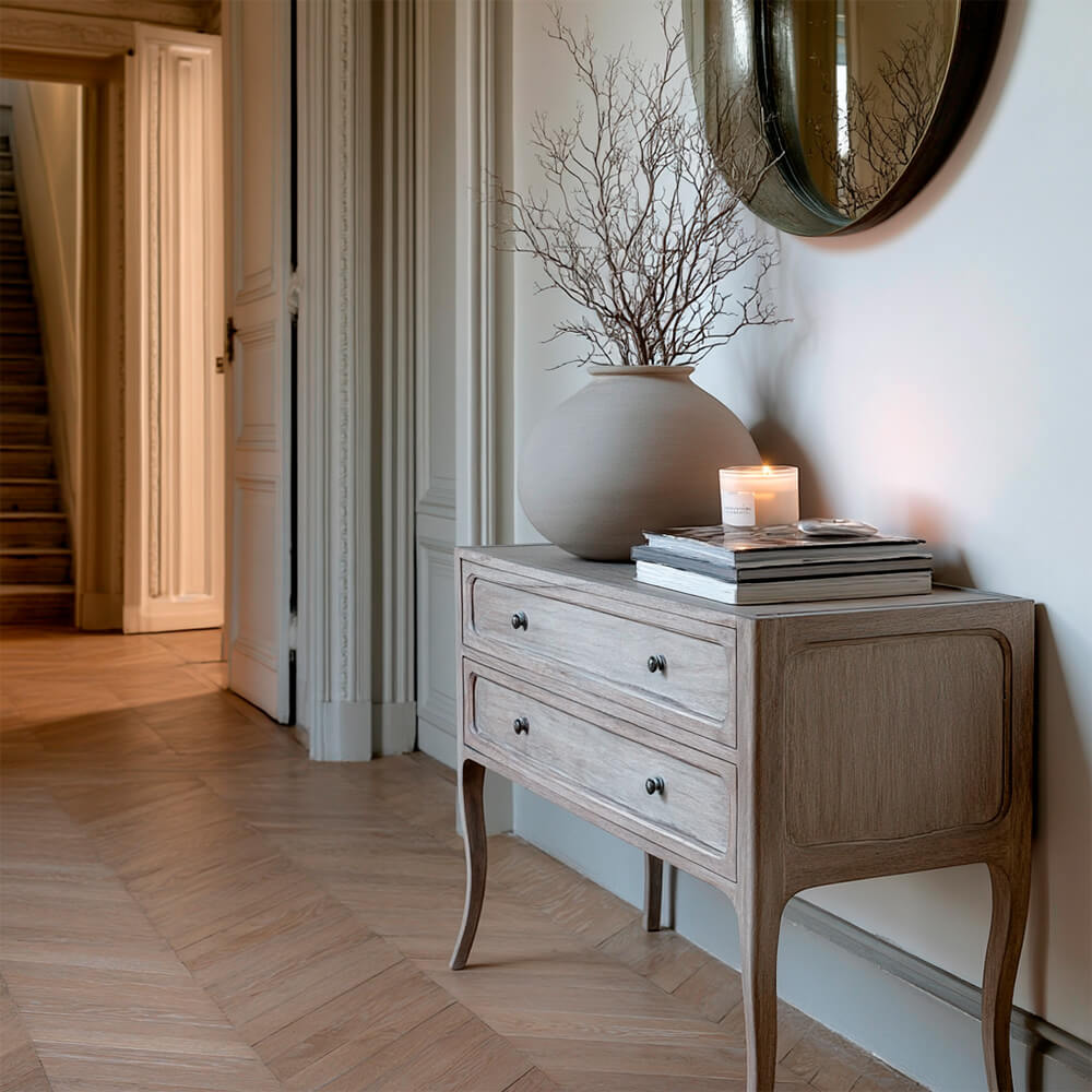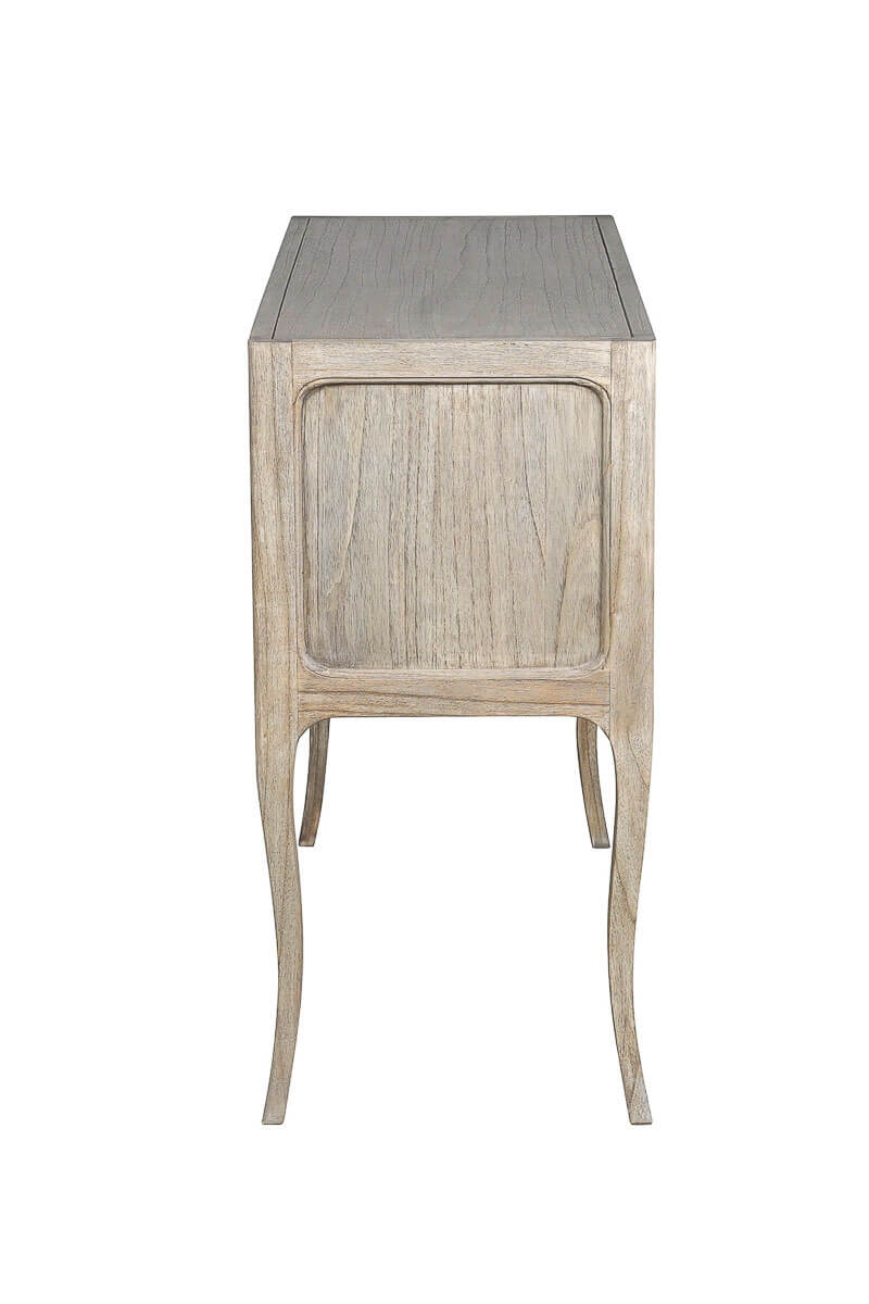 La hermosa madera de mindi acabada en tonos naturales patinados y los tiradores de estilo vintage envejecido, elevarán el nivel de tu decoración y darán un toque personal de estilo elegante y sofisticado a tu hogar.