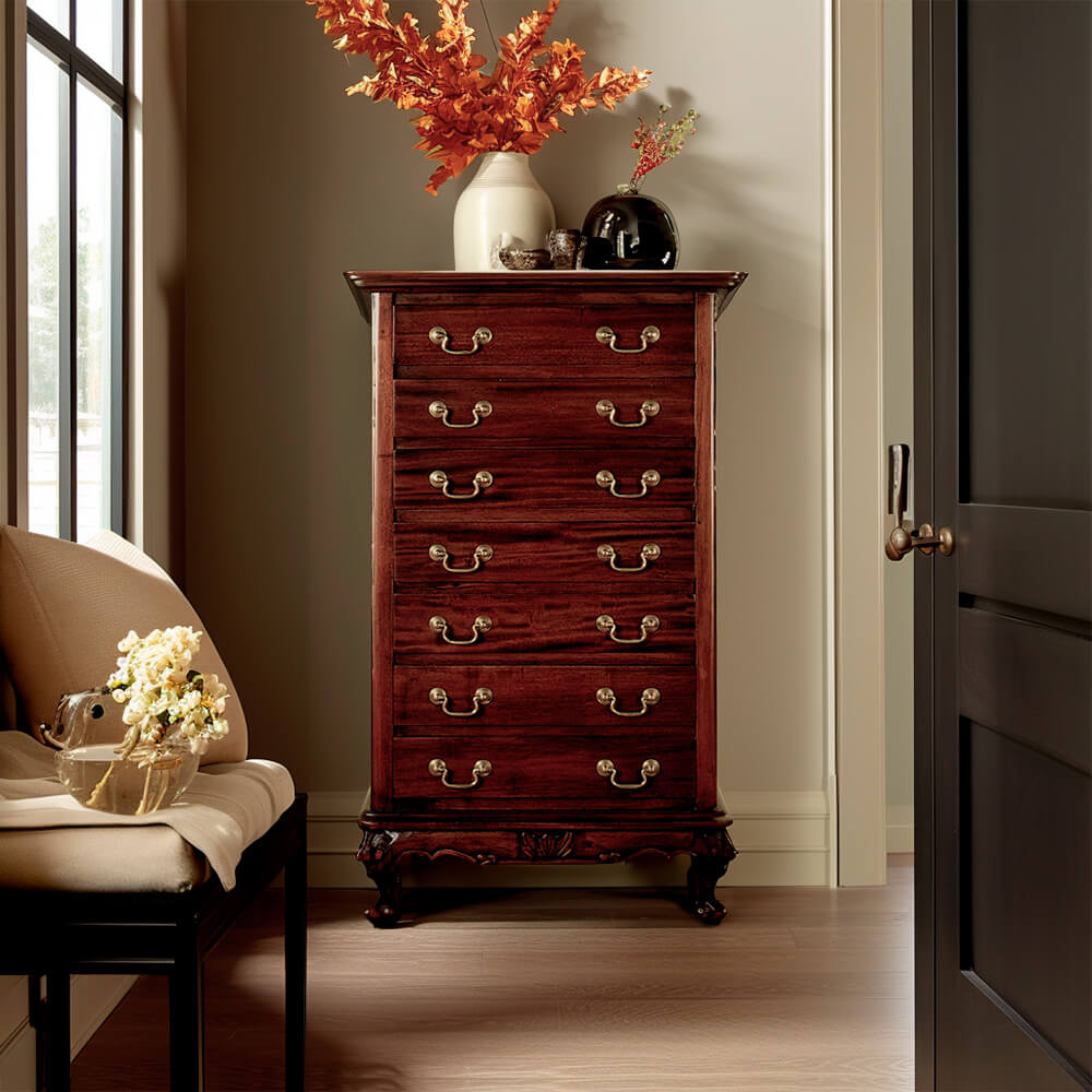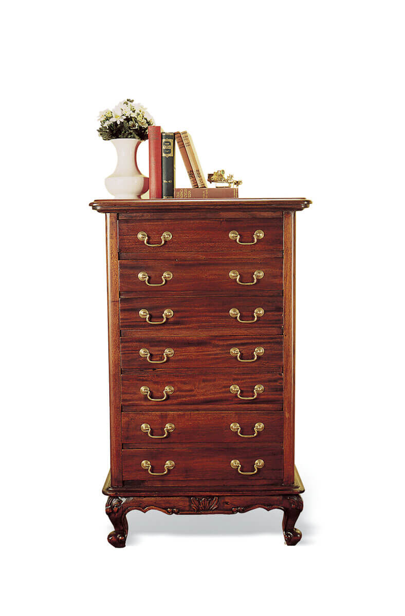 Una buena solución a la escasez de espacio es una comoda sifonier como el que os mostramos. De estilo clásico, realizado en caoba maciza es bastante amplio, ya que dispone de cajones. Combina a la perfección con espacios de estilo, y también como pieza vintage en ambientes más modernos.