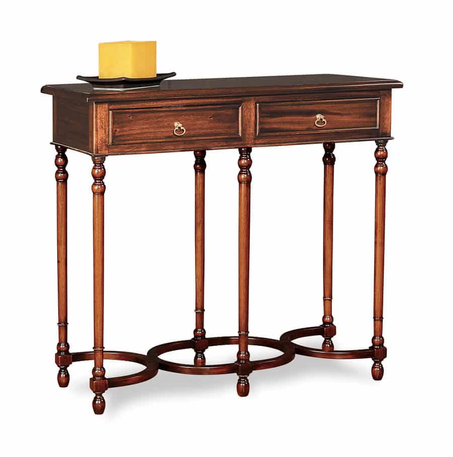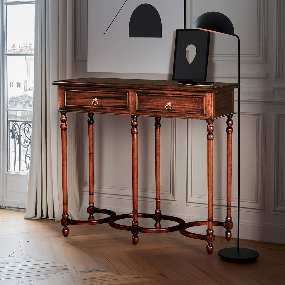 Descubre la auténtica artesanía con nuestra  Consola de madera maciza con dos cajones, elaborada de manera artesanal para brindarte un toque único y distintivo en tu espacio. Cada detalle refleja la maestría de nuestros artesanos, creando una consola que no solo es funcional, sino también una obra de arte en sí misma. La madera maciza utilizada resalta su durabilidad y belleza natural, aportando calidez y encanto a cualquier rincón de tu hogar.