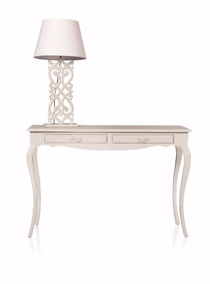 La consola Daze es parte de la colección La Rochelle, una gama de muebles artesanales con un estilo chic romántico que se inspira en los muebles clásicos franceses. La atención al detalle en su elaboración es evidente en cada parte de la consola, desde sus patas talladas a mano hasta sus dos cajones funcionales.