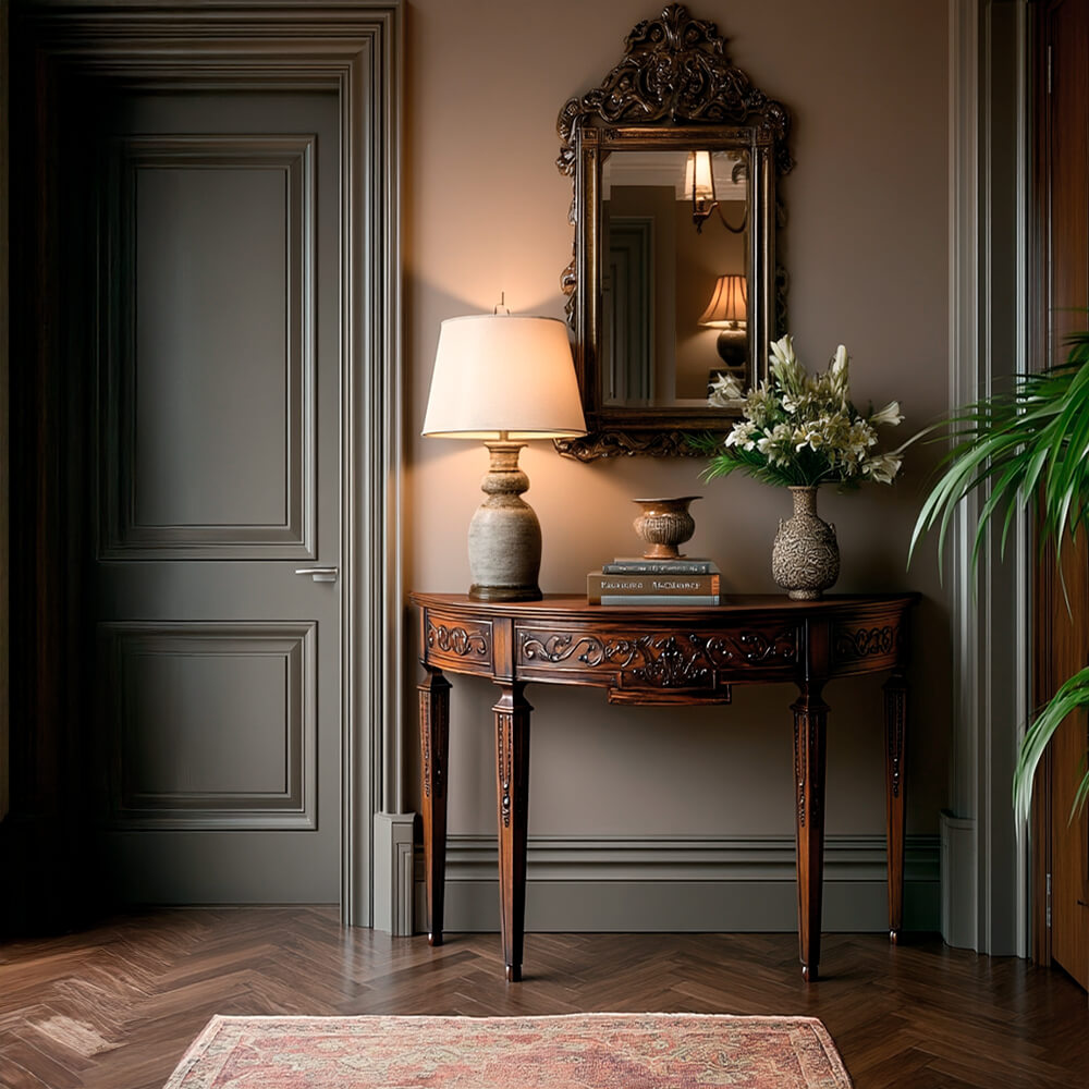 La consola Francesa es una pieza de mobiliario elegante y sofisticada que añadirá un toque clásico o vintage a la entrada de tu hogar. Realizada en caoba maciza por expertos artesanos, esta consola está exquisitamente tallada a mano con una atención meticulosa al detalle en su acabado.