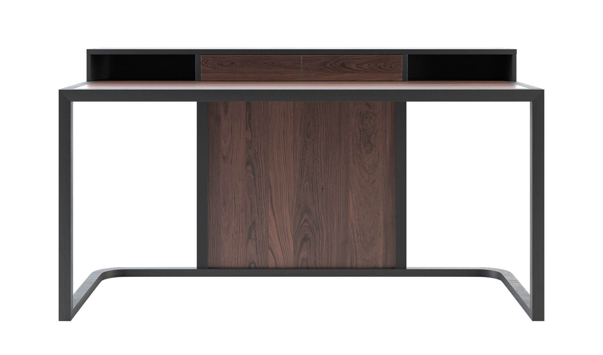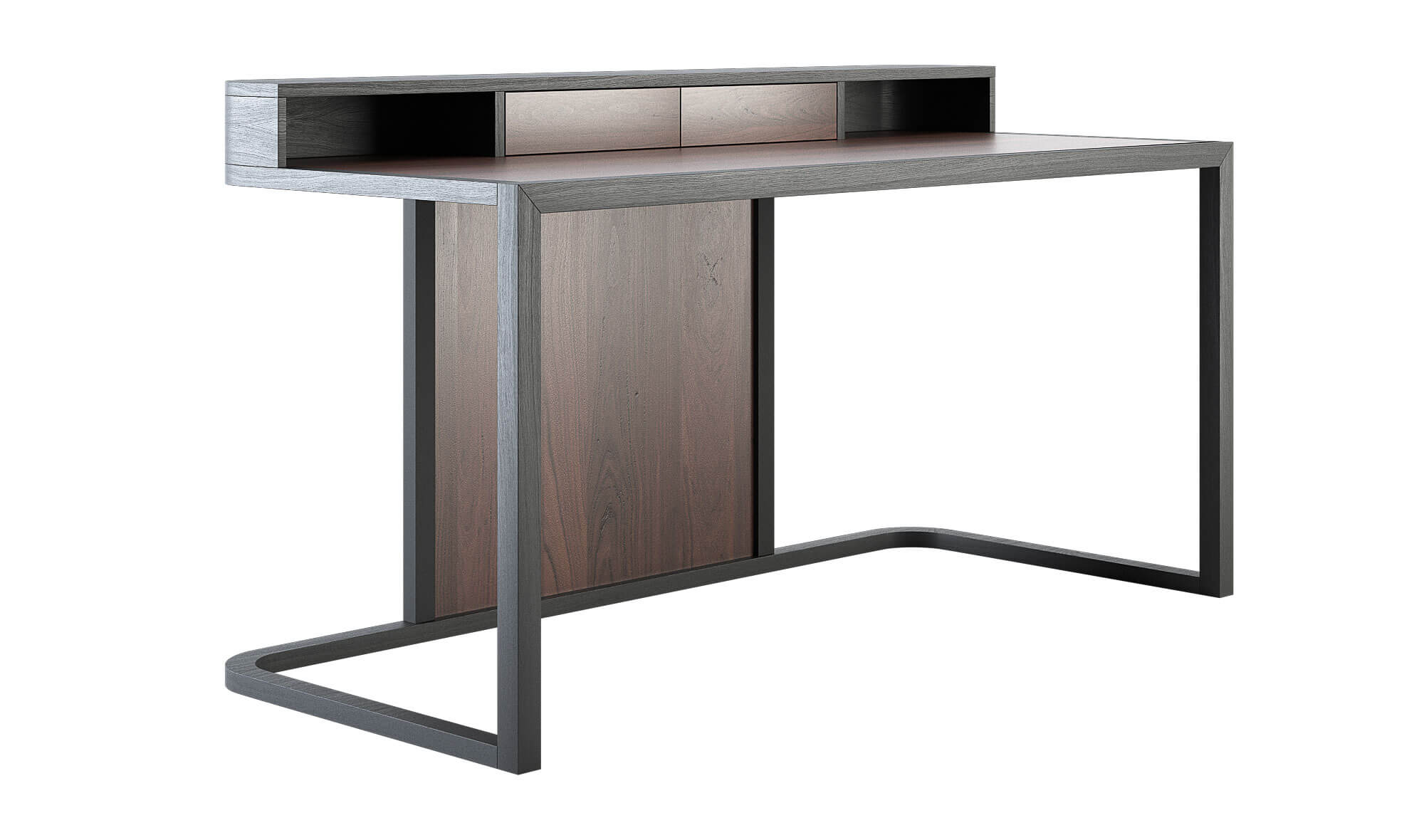 Mesa de escritorio realizada con base en fresno acabado antracita, fresno blanqueado o fresno natural. Tapa, frente de cajones y trasera en nogal canaletto o eucalipto fumé.