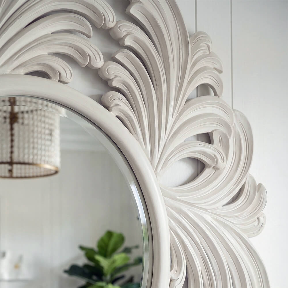 En resumen, el espejo Fougère es una obra maestra de diseño que combina la artesanía tallada a mano en madera de mindi con un estilo chic romántico. Su forma redonda, acabado pintado a mano en tono blanco roto lo convierten en una pieza de elegancia atemporal. Si buscas un espejo que añada glamour y estilo a tus espacios, el espejo Fougère es la elección perfecta para crear una atmósfera encantadora y sofisticada.