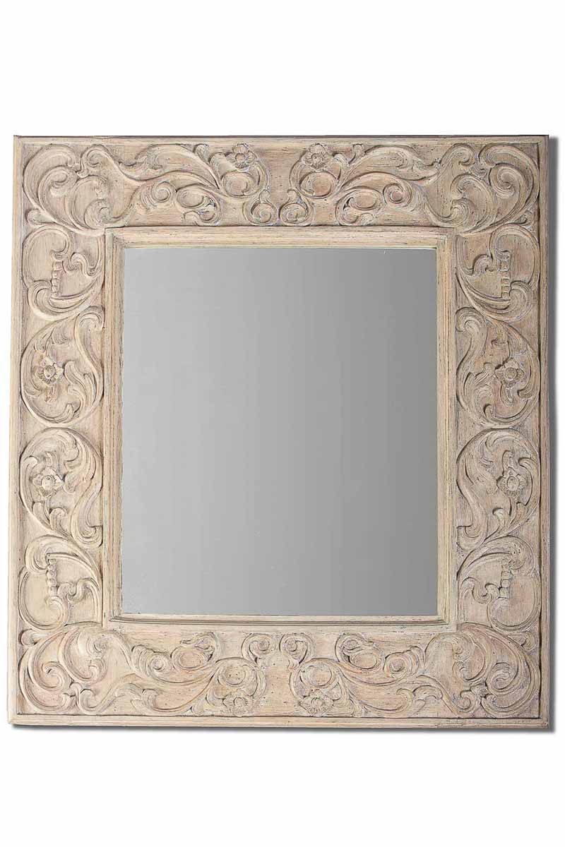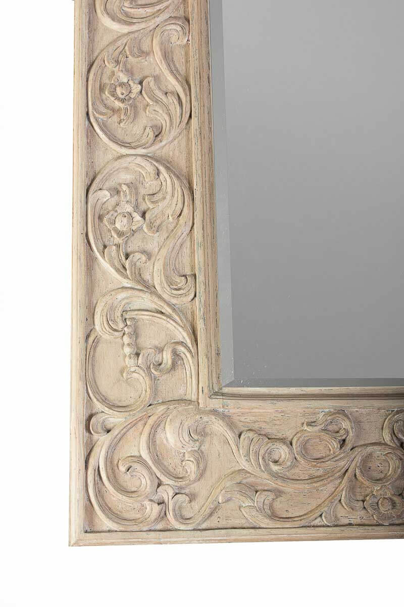 El acabado del marco en tono natural con una patina blanquecina y grisácea resalta la belleza natural de la veta de la madera de mindi. Esta combinación de tonos suaves y sutiles crea una apariencia elegante y sofisticada, además de añadir un toque vintage y romántico al espejo.