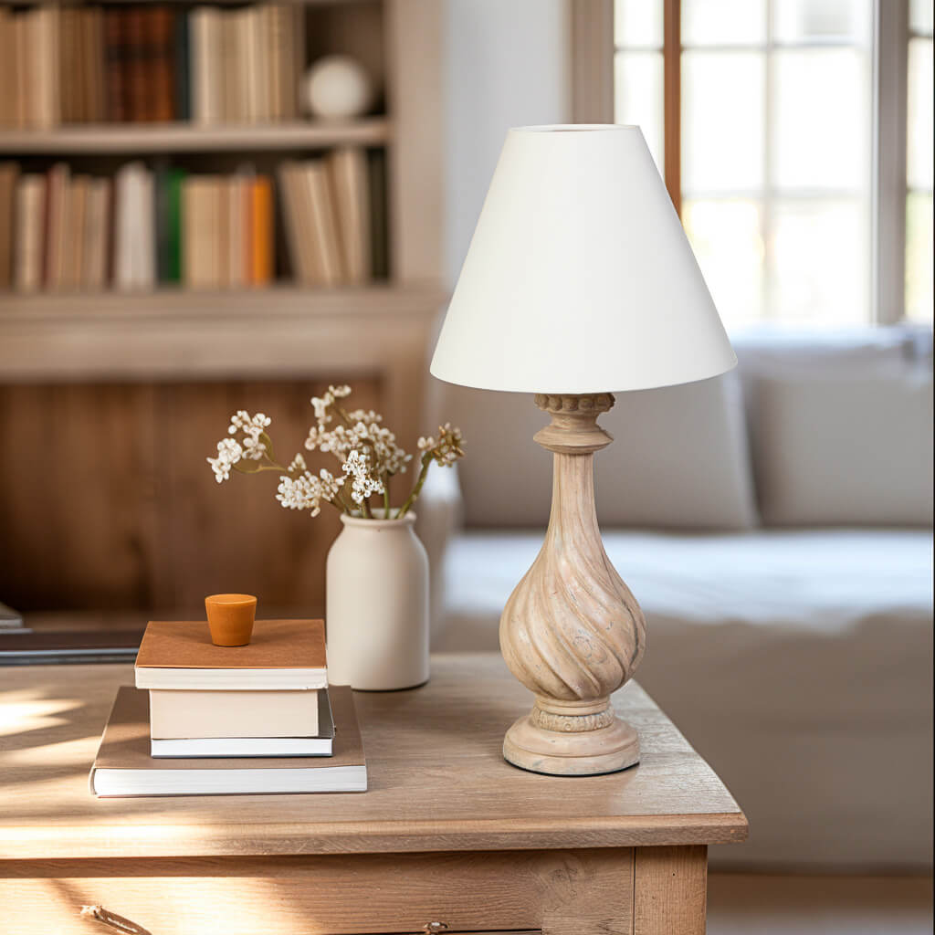 Déjanos presentarte la impresionante lámpara de mesa Fontainebleau, una verdadera joya artesanal que cautivará todos los sentidos. Cada detalle de esta lámpara ha sido cuidadosamente elaborado a mano y tallado por nuestros expertos artesanos en madera de mindi, quienes han dedicado su talento y pasión para crear una pieza única.