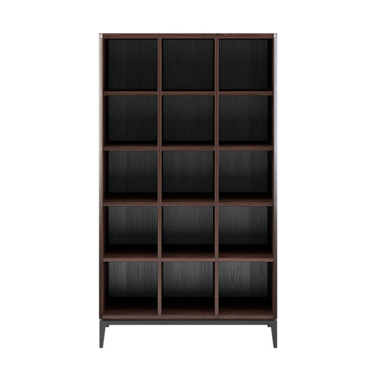 Librería realizada con base en fresno antracita, fresno blanqueado o fresno natural. El cuerpo está realizado en chapa natural de nogal canaletto o eucalipto fumé.