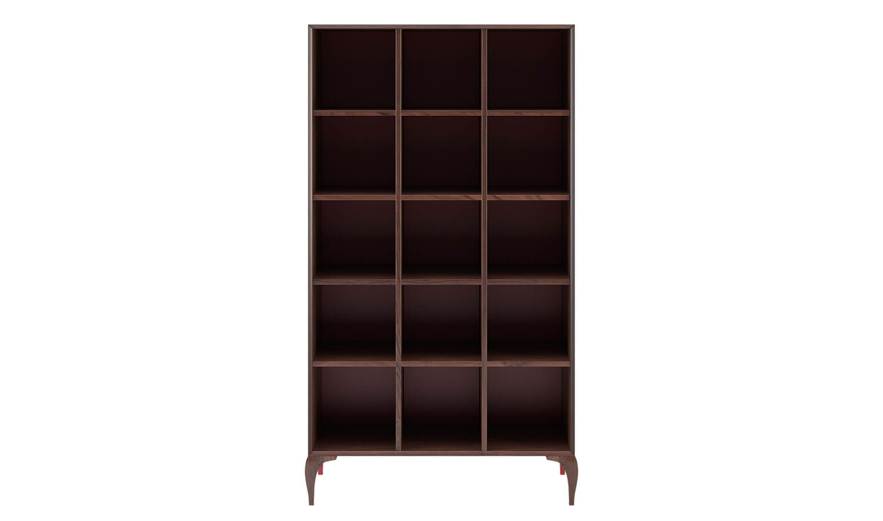 Librería realizada en chapa natural de nogal canaletto o eucalipto fumé. Ondas en nogal canaletto. Trasera del mueble e interiores de patas en laca rubí (RAL 3003) o chapa natural de nogal canaletto.