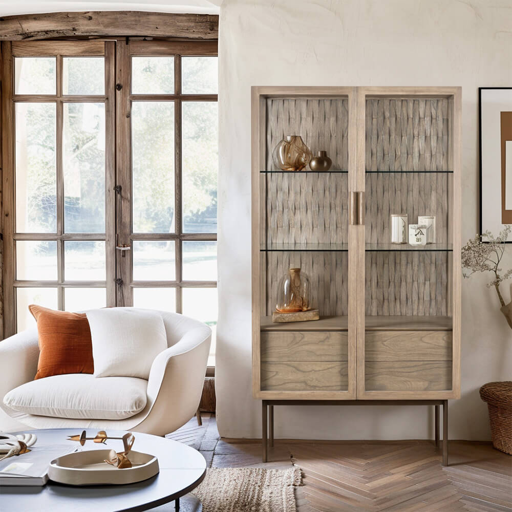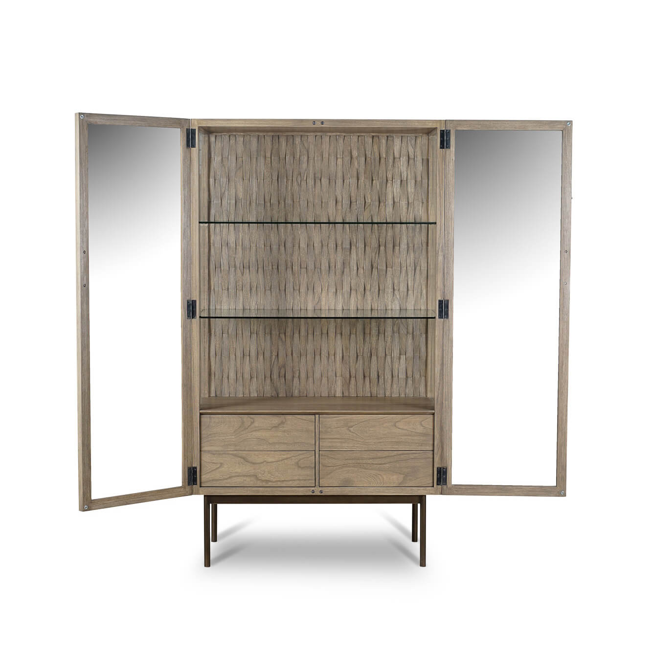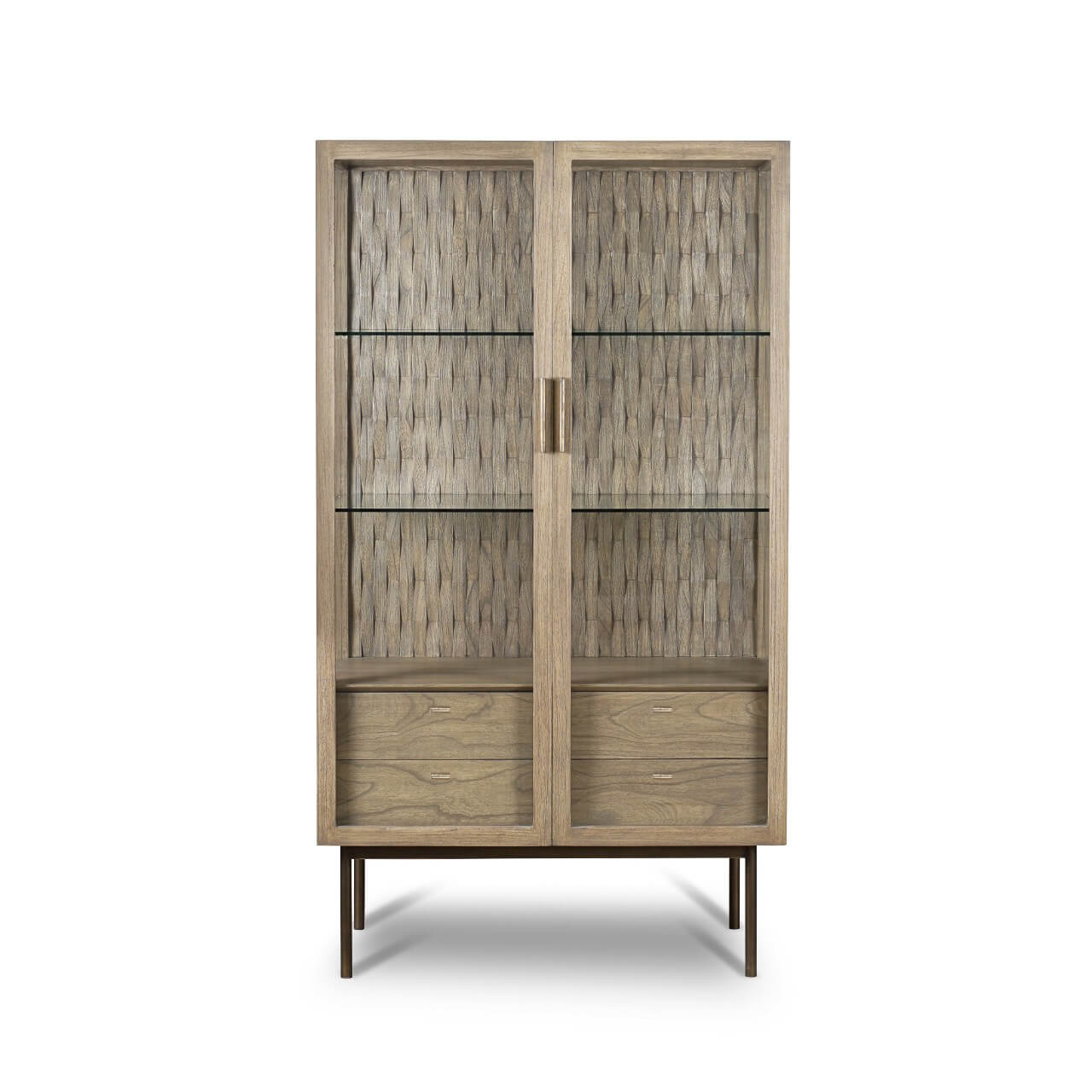 El acabado natural de la madera patinada en tonos griasceos, junto con los tiradores en laton macizo fundido en molde de arena, y las patas de metal acabadas en latón oscuro envejecido (Dark Brass Metal) añaden drama a una estética tribal moderna a la vitrina Busa.