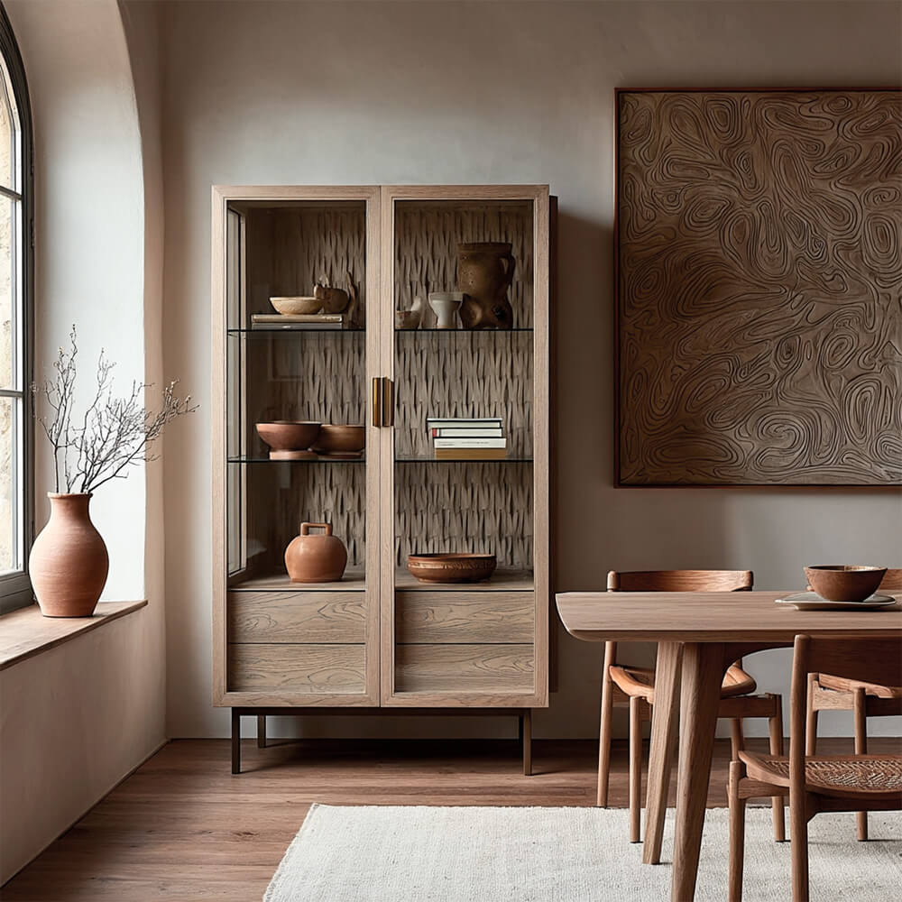 Sus puertas acristaladas son perfectas para lograr que la estancia parezca más amplia cumpliendo, por supuesto, a la vez con su finalidad de almacenaje. Además de que por sus cristales pasara toda la luz que entre por las ventanas, o la que haya en la estancia, dando visibilidad a su contenido. En ella podremos exhibir nuestras mejores piezas de la vajilla, cristalería, artículos decorativos o de coleccionista.