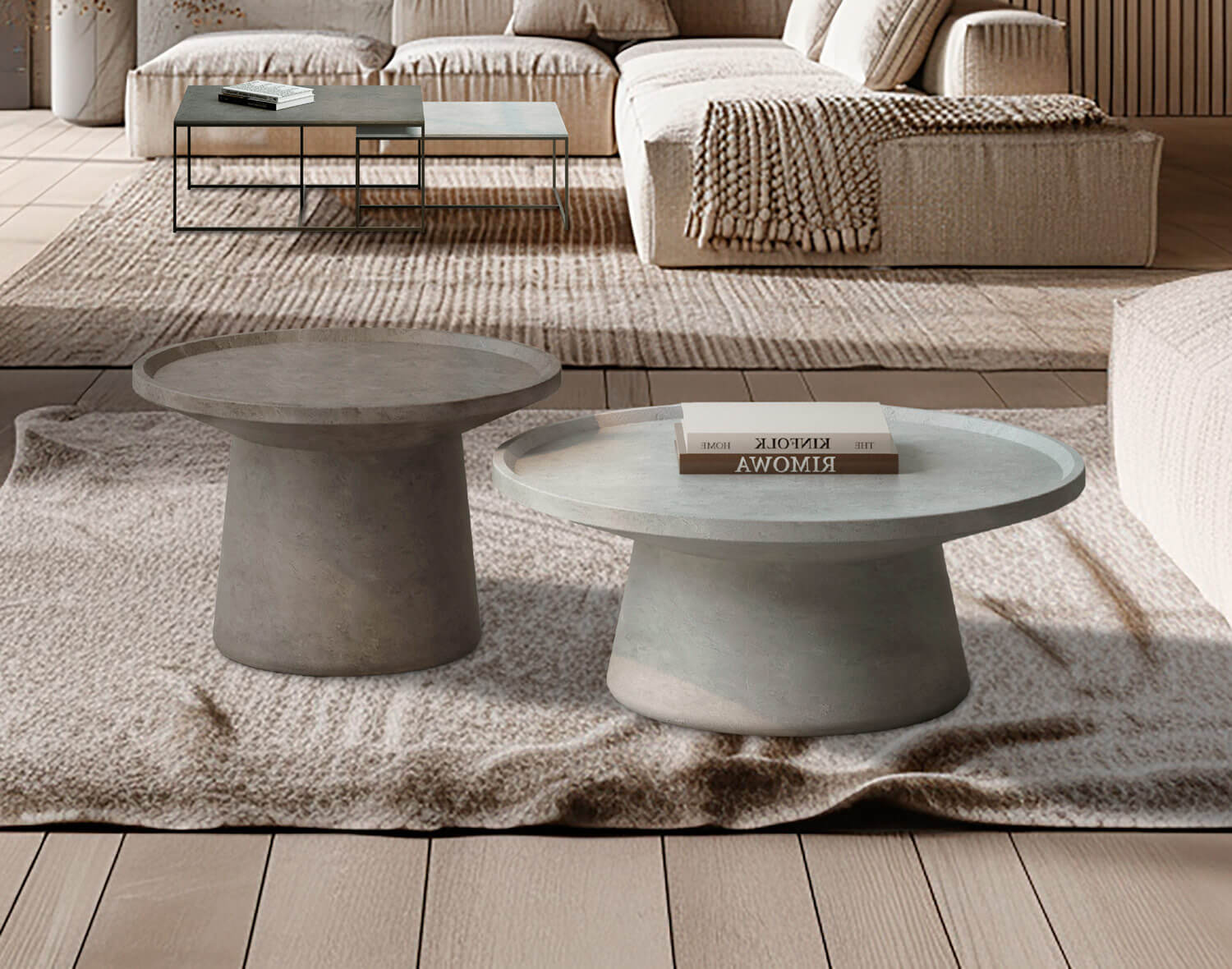 Set de dos mesas circulares con bases cónicas, acabadas a mano en Mortex. Una mesa en blanco y la otra en gris, ambas con un diseño moderno y elegante que resalta en cualquier entorno.