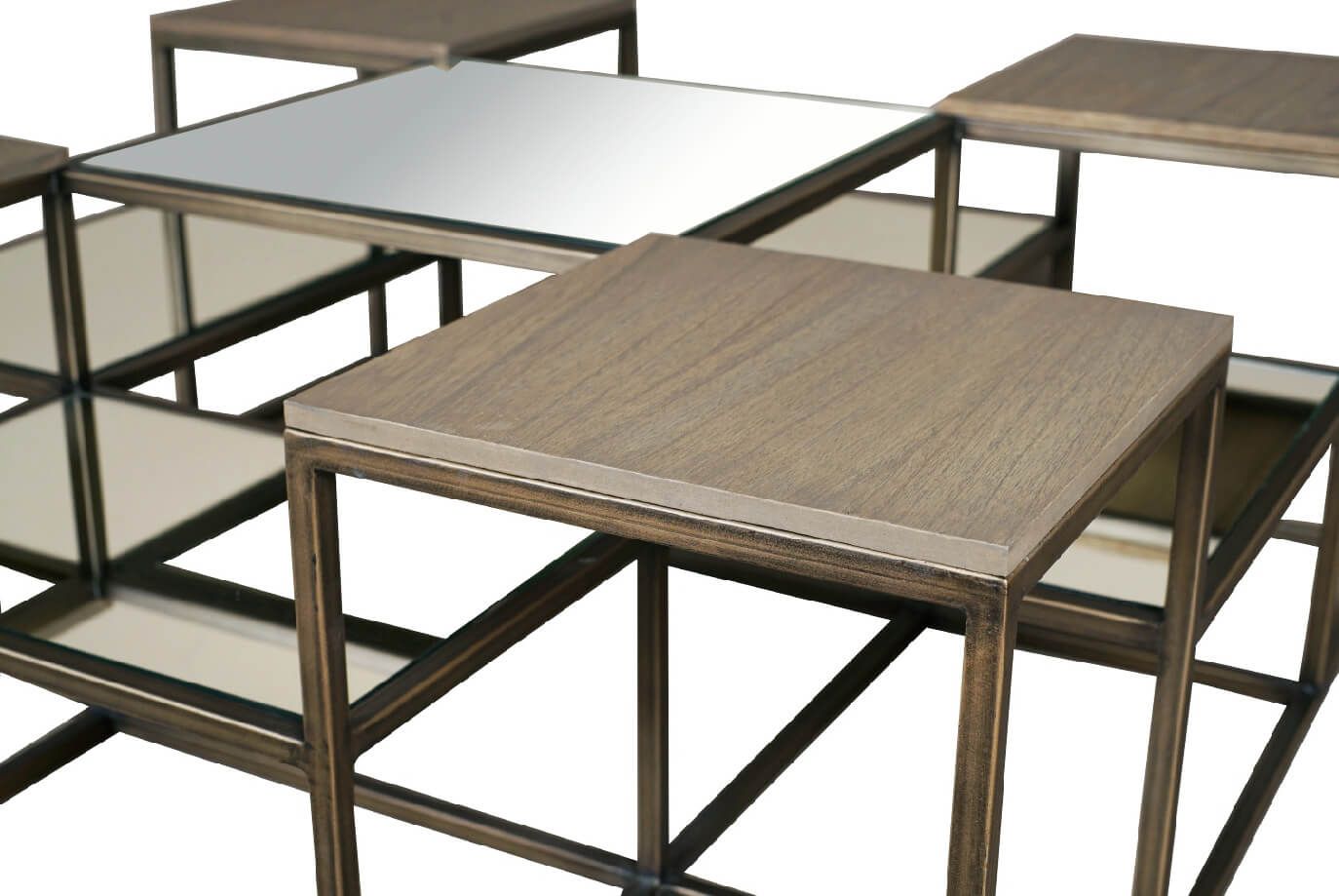 La disposición escalonada de los estantes, la mezcla de acabados, encimeras en madera y espejo y el dorado envejecido la estructura metálica de la mesas crean un encanto especial. El diseño excepcional de esta mesa de centro llamará la atención en tu salón.