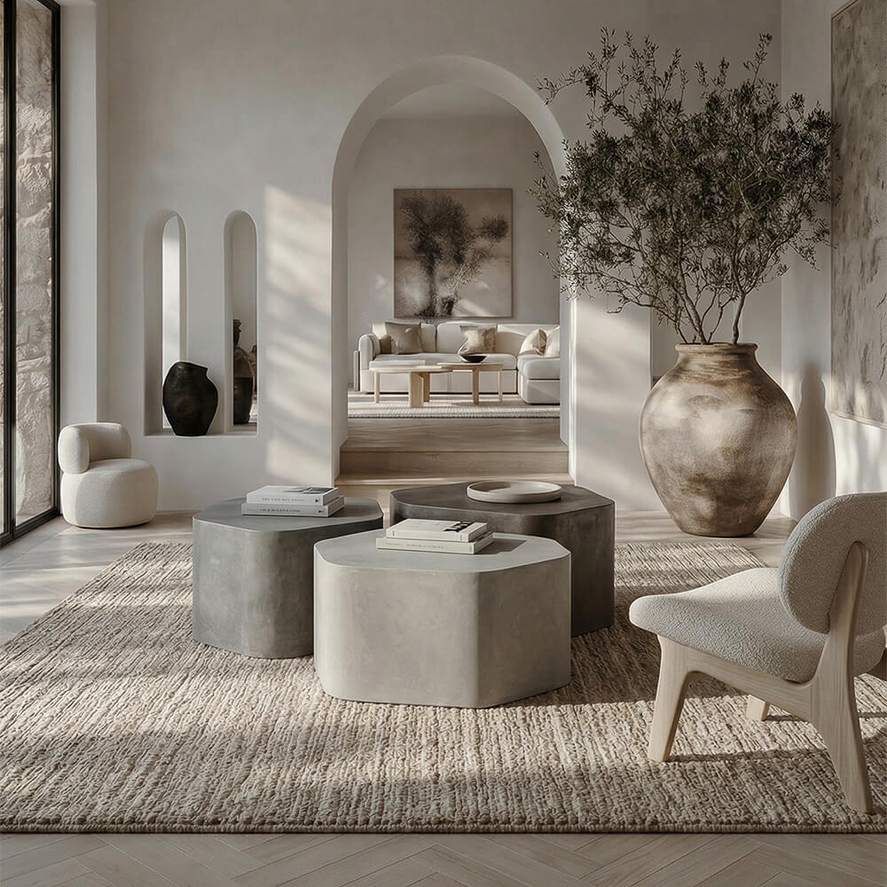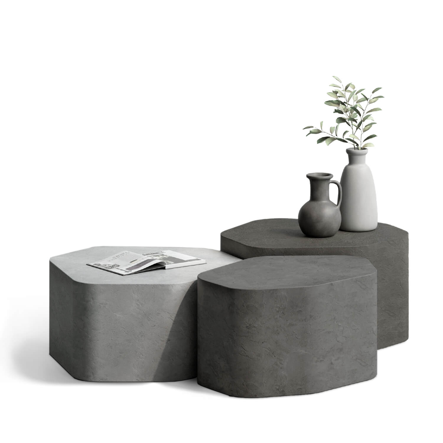 Este set de tres mesas auxiliares destaca por su diseño orgánico y su acabado artesanal en Mortex, un material de alta calidad que aporta un toque de sofisticación a cualquier espacio. Con tres tonos de gris cálido, estas mesas ofrecen una estética versátil y moderna que se adapta perfectamente a diversos estilos de decoración.
