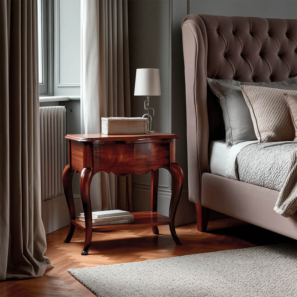 Ésta que nos ocupa esta pertenece al dormitorio Cannes de la colección de Keen réplicas. Realizada en caoba maciza, es perfecta por su ligereza al tener un solo cajón y una útil repisa.