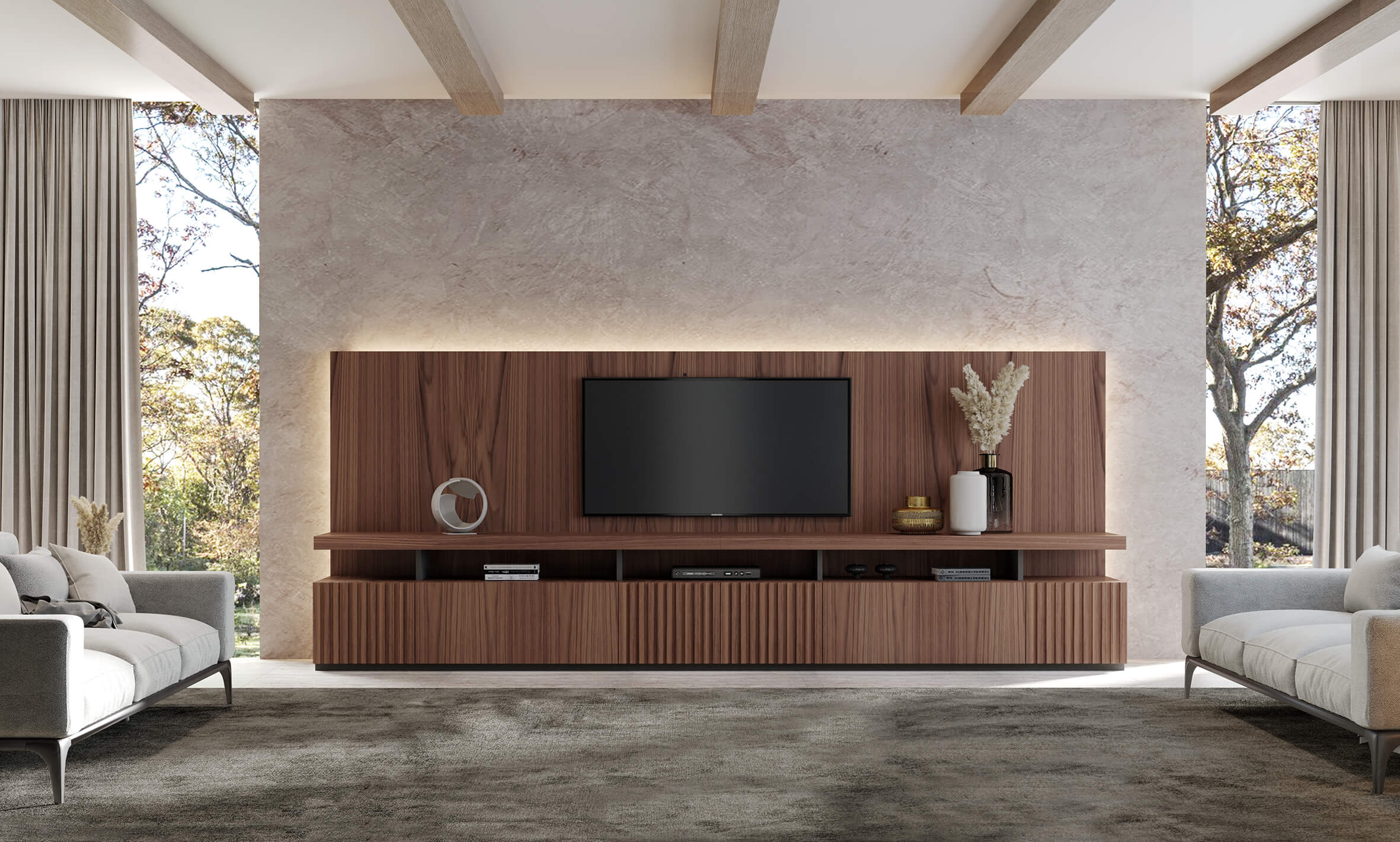 Mueble de tv con base en DM lacado RAL 7016. Frentes, plafón trasero y baldas en chapa natural de nogal o eucalipto fumé.