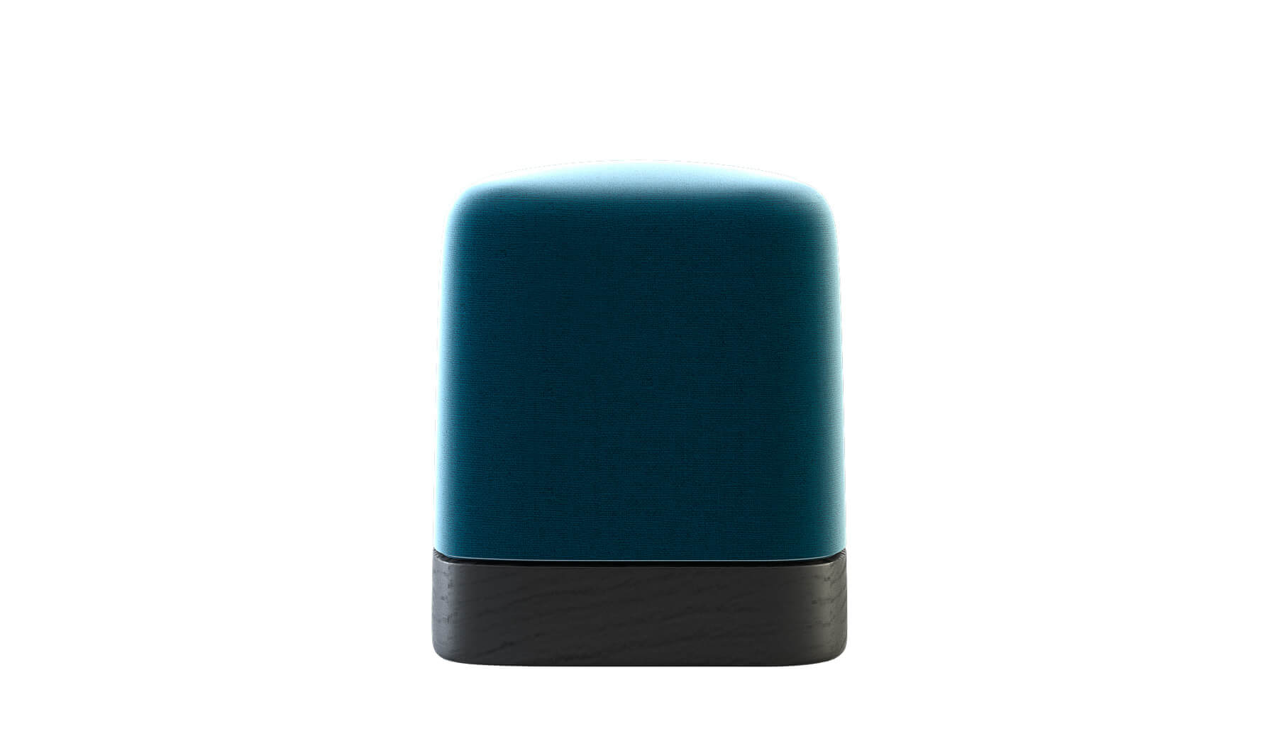 Puff revestido de tejido en tela cliente, símil nobuk, ecopiel o piel natural. Base realizada en fresno antracita, fresno blanqueado o fresno natural.