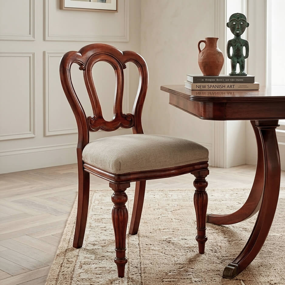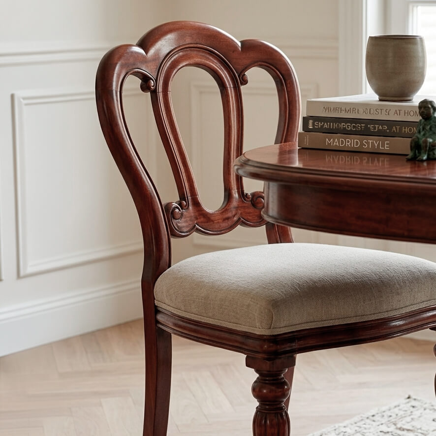 La Silla Almirante tiene es de estilo victoriano, caracterizado por líneas curvas y elegantes, y está diseñada con patas estriadas que le dan una apariencia sofisticada y atemporal. El respaldo y el asiento están cuidadosamente tallados y acolchados para proporcionar comodidad y apoyo.