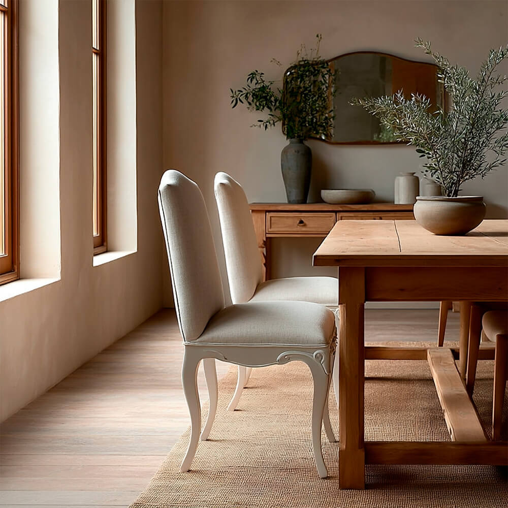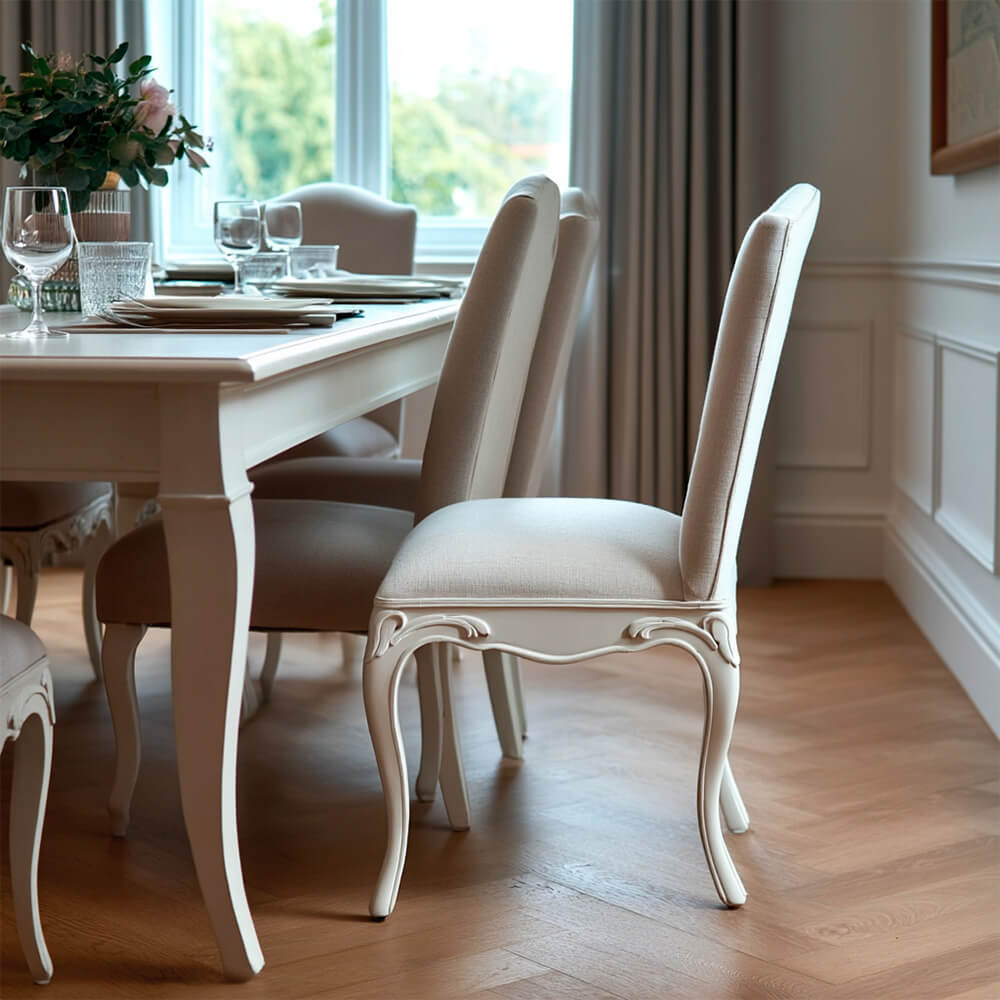 La silla Killy es una pieza elegante y refinada, ideal para aportar un toque de glamour a cualquier estancia. Realizada a mano por expertos artesanos en madera de mindi y pintada a mano en un tono blanco roto, su acabado patinado le confiere un aspecto envejecido que se integra a la perfección en ambientes de estilo vintage y chic romántico, así como en ambientes más contemporáneos siendo el contrapunto perfecto para dar carácter a tu salón comedor.