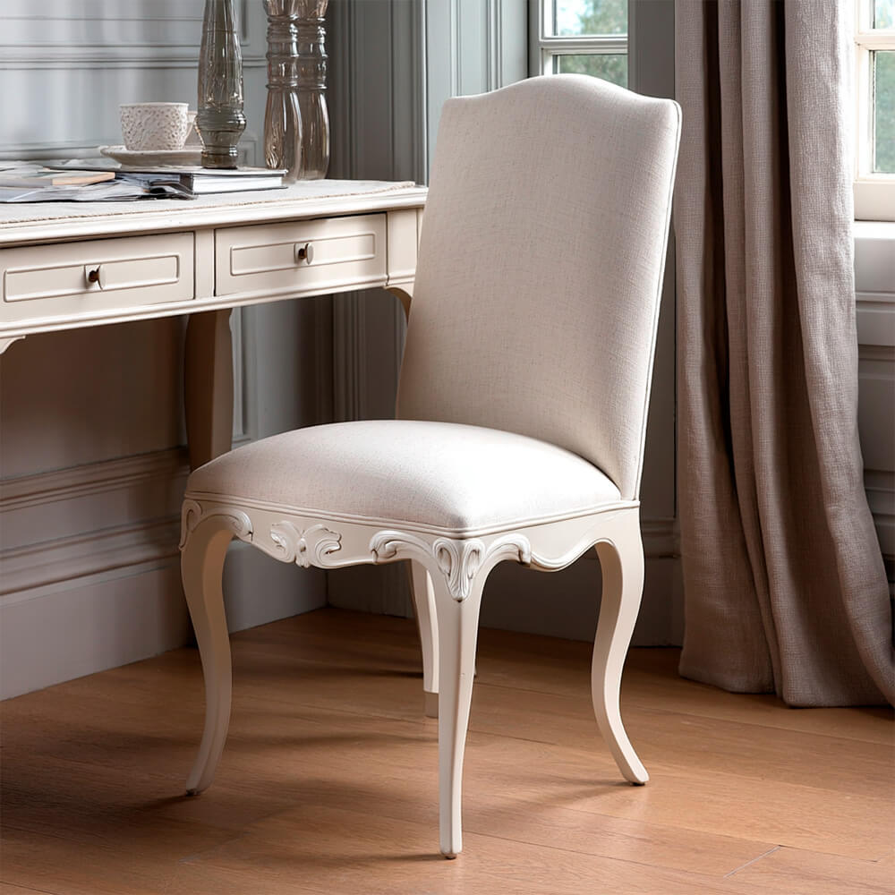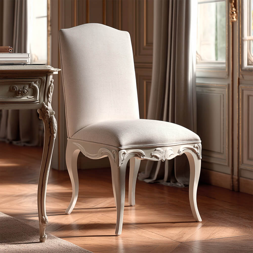 Su diseño se inspira en el estilo francés, con líneas curvas y suaves, y detalles tallados a mano en la madera que aportan un toque de sofisticación y distinción. El tapizado en la tela de la imagen, una mezcla de lino y poliéster, le da un acabado suave y agradable al tacto, además de ser fácil de mantener.
