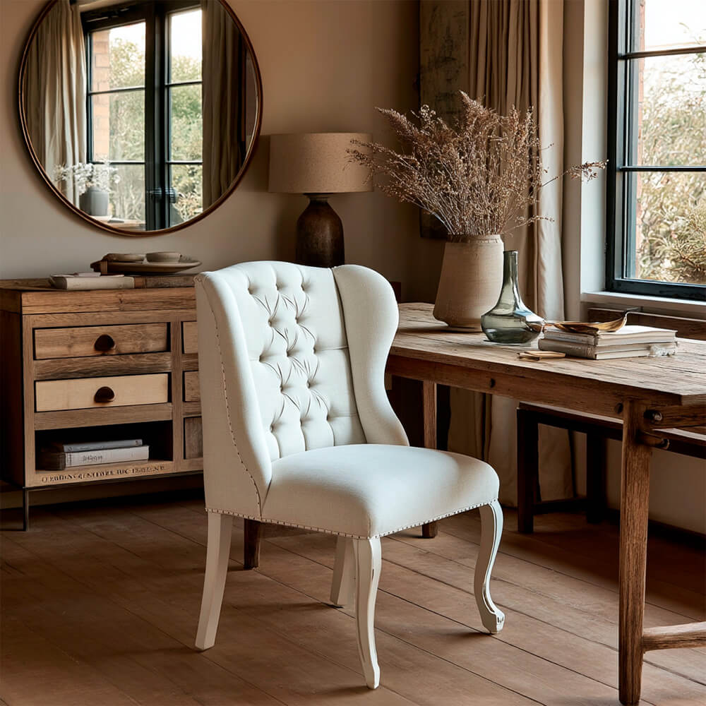 Este sillón es una opción perfecta para crear un ambiente refinado en cualquier comedor. La combinación de la madera de mindi con el acabado en blanco roto, junto con la tela mezcla de lino y poliéster en la que está tapizado, hacen que el sillón Keith sea una pieza versátil que puede adaptarse a diferentes estilos decorativos.