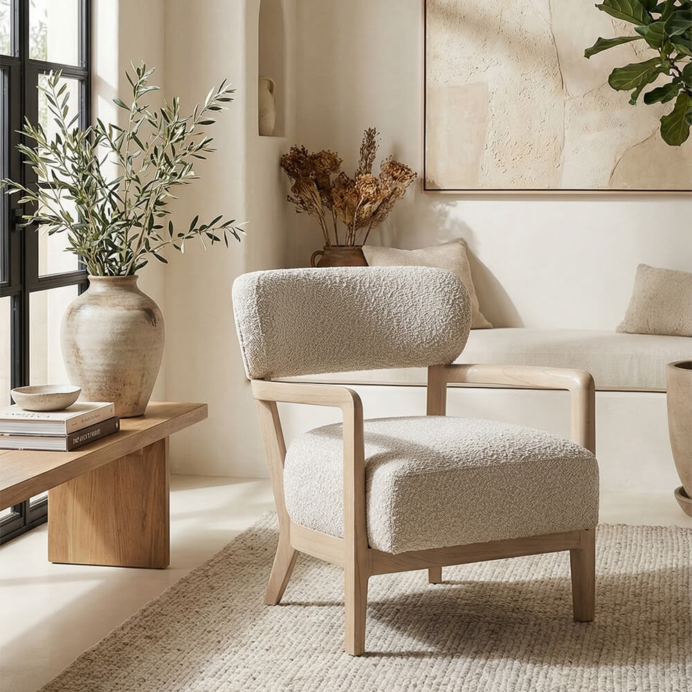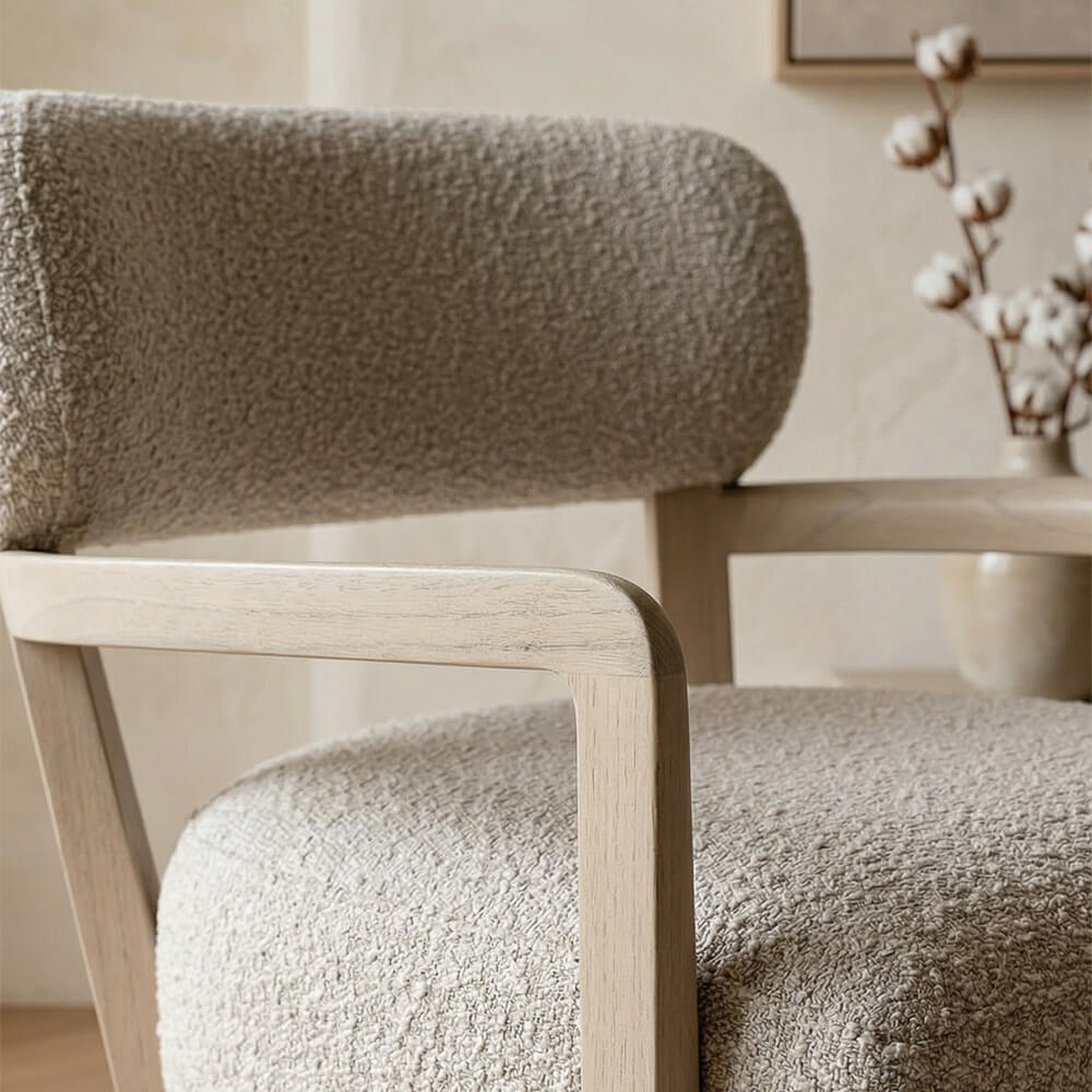 Su tapicería en color beige no solo resalta la delicadeza de la madera, sino que también proporciona una sensación de frescura y modernidad, ideal para estilos contemporáneos y luminosos. Esta butaca es perfecta para aquellos que buscan un mueble que combine artesanía tradicional con diseño moderno, creando un equilibrio entre lo clásico y lo actual.