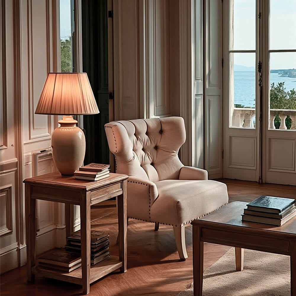 Tapizado en una tela de mezcla de lino y poliéster que se complementa perfectamente con el acabado de la madera, este sillón se convertirá en el centro de atención de cualquier habitación en la que lo coloques. Si estás buscando añadir un toque de glamour y elegancia a tu hogar, el sillón orejero Barejes es la elección perfecta.