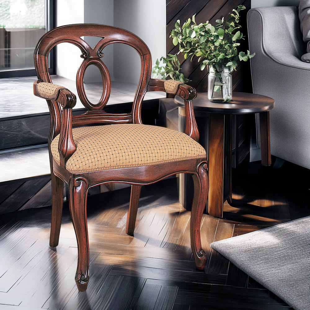 El acabado en tono caoba anogalado, resalta la hermosura de la madera y da como resultado una butaca de diseño elegante y sofisticado. Su estilo clásico hace que se adapte a cualquier espacio decorativo, aportando elegancia y carácter a las decoraciones más actuales.