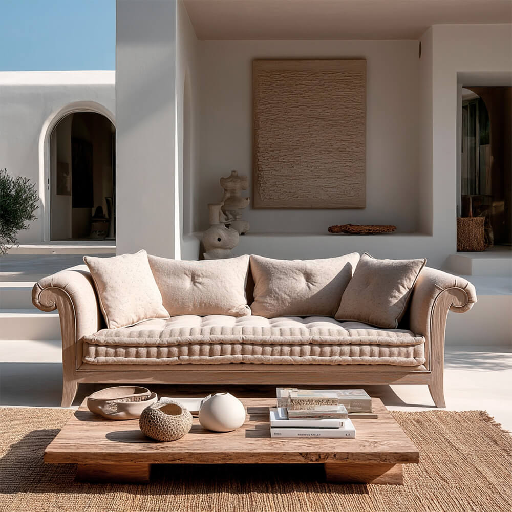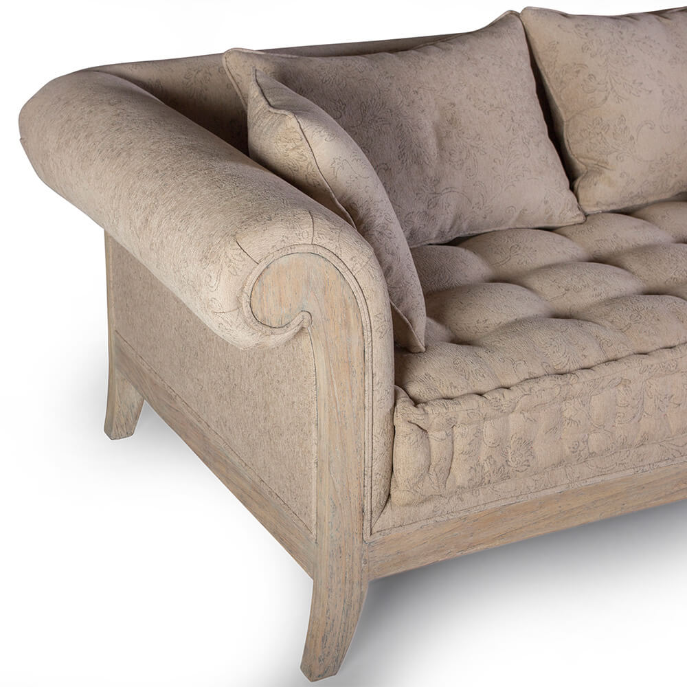 El sofá Mazan es una pieza única que combina confort, diseño clásico y calidad artesanal. Tapizado con materiales de alta durabilidad, destaca por su sólida estructura en madera de mindi maciza, cuidadosamente elaborada a mano y terminada con un acabado roble patinado que aporta calidez y personalidad a cualquier ambiente.
