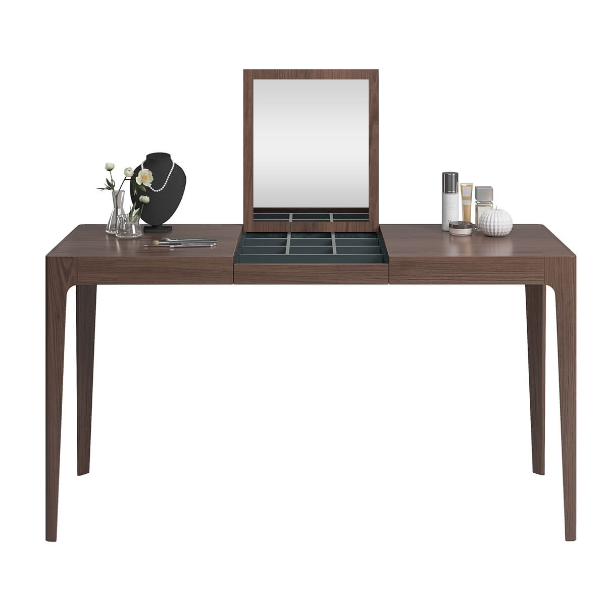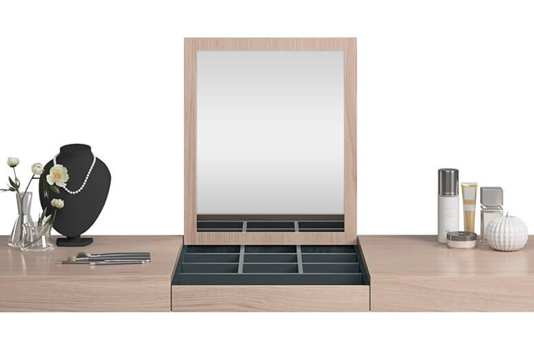 Tocador realizado en chapa natural de nogal o roble y DM lacado. Interior en gris antracita. Tapa con espejo.