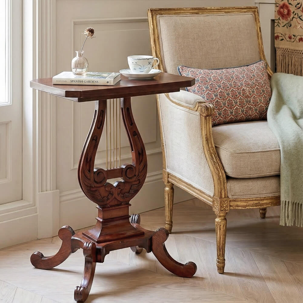 Este velador destaca por su estructura estilizada y por la incorporación de elementos decorativos como la característica forma de lira, que aporta personalidad y un sutil carácter escultórico. Su diseño lo convierte en un mueble auxiliar versátil, ideal para acompañar sofás, butacas o zonas de descanso.