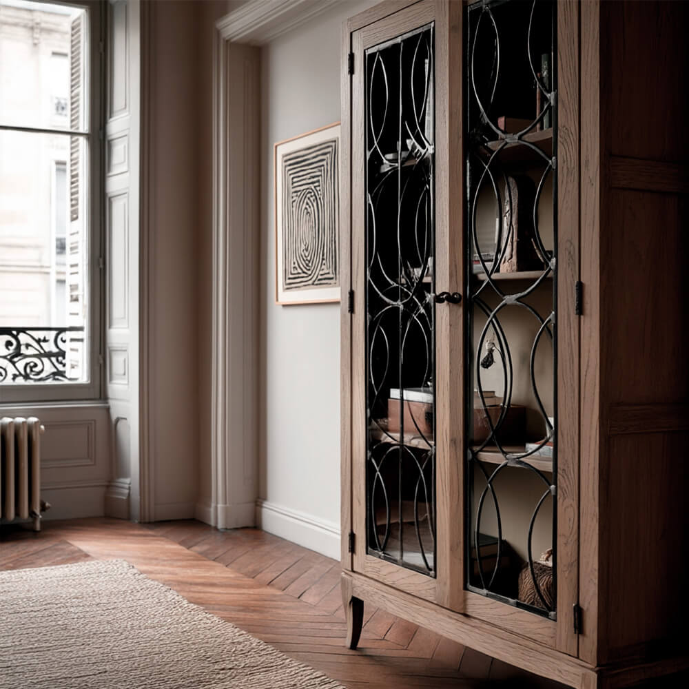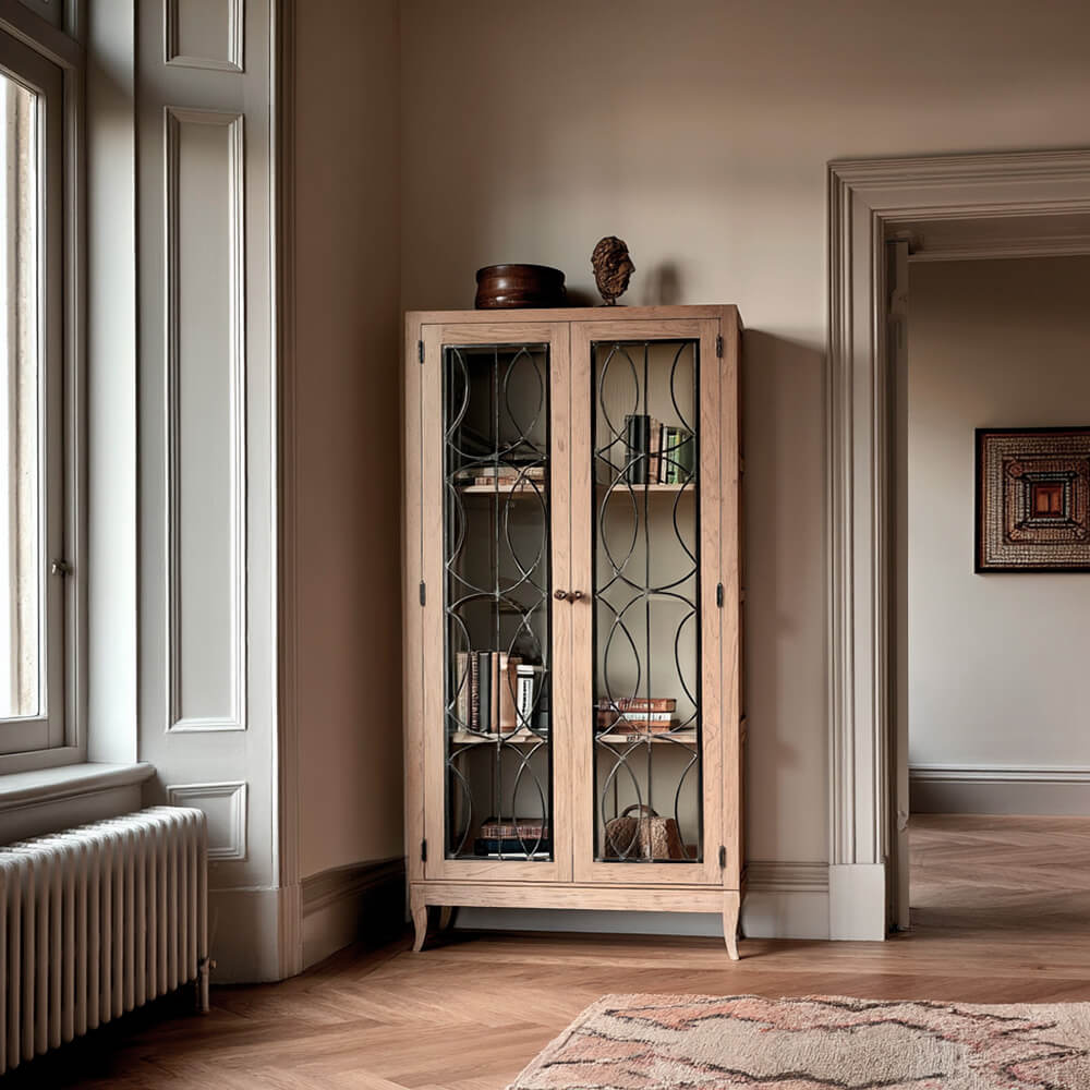 Otro mueble perfecto para lograr que la estancia parezca más grande es una vitrina acristalada. Además de que por sus cristales puede pasar toda la luz que entre por las ventanas, o la que haya en la estancia, en ella podremos exhibir nuestras mejores piezas de la vajilla, cristalería, o artículos de coleccionista. La combinación de materiales naturales,madera y hierro envejecido, aportan personalidad a esta pieza.